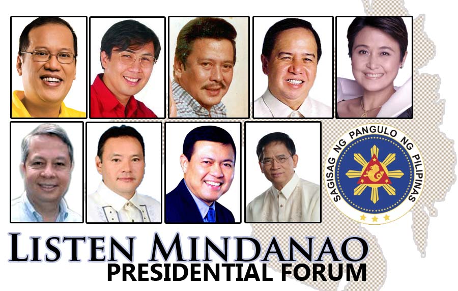 On April 16, 2010, Listen Mindanao: We Care for You. The Presidential candidates agenda for Mindanao: A conversation on peace and development with Mindanao civil society and other stakeholders.” will be held in Davao City. This is an event organized by the Initiatives for International Dialogue (IID), the Bishops Ulama Conference (BUC), Initiatives for International Dialogue (IID) Mindanao Peaceweavers (MPW), Kusog Mindanaw!, Mindanao Business Council (MBC), Mindanao Commission on Women (MCW), Mindanao Association of State Colleges and Universities Foundation (MASCUF), National Ulama Conference of the Philippines (NUCP) and the Philippine Council for Islam and Democracy (PCID).